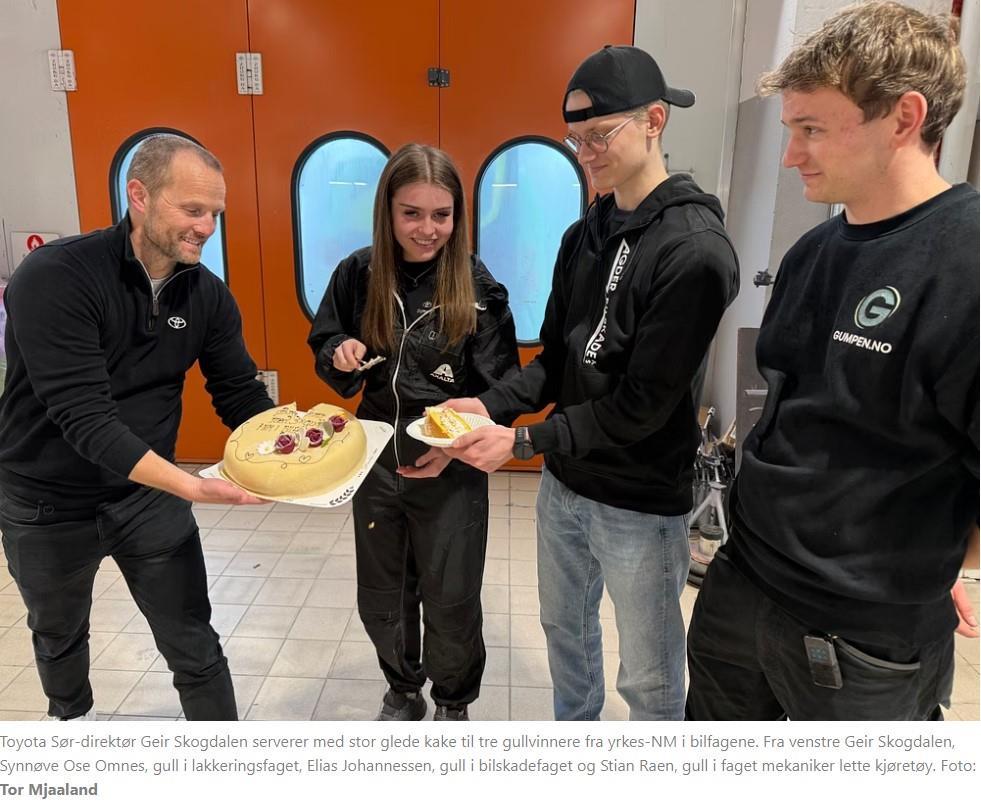 – Gratulerer med gullmedaljene i Yrkes-NM, sier en stolt Toyota-Sør-direktør Geir Skogdalen og serverer «seierskake».